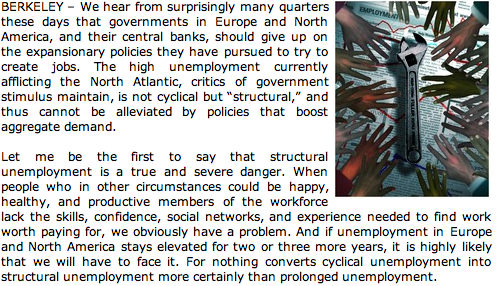 This is not structural unemployment, this a collapse of demand that can be repaired with proper stimulus. “This may well look like structural unemployment in three years. In three years, we may well see labor shortages, rising wages, and increasing prices in expanding sectors, accompanied by high unemployment elsewhere in the economy.” - When Long Term Unemployment Becomes Structural